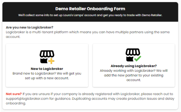 Note: If you are already working with another retailer through Logicbroker, DO NOT click on New to Logicbroker. Doing so will create a duplicate account and delay your onboarding.