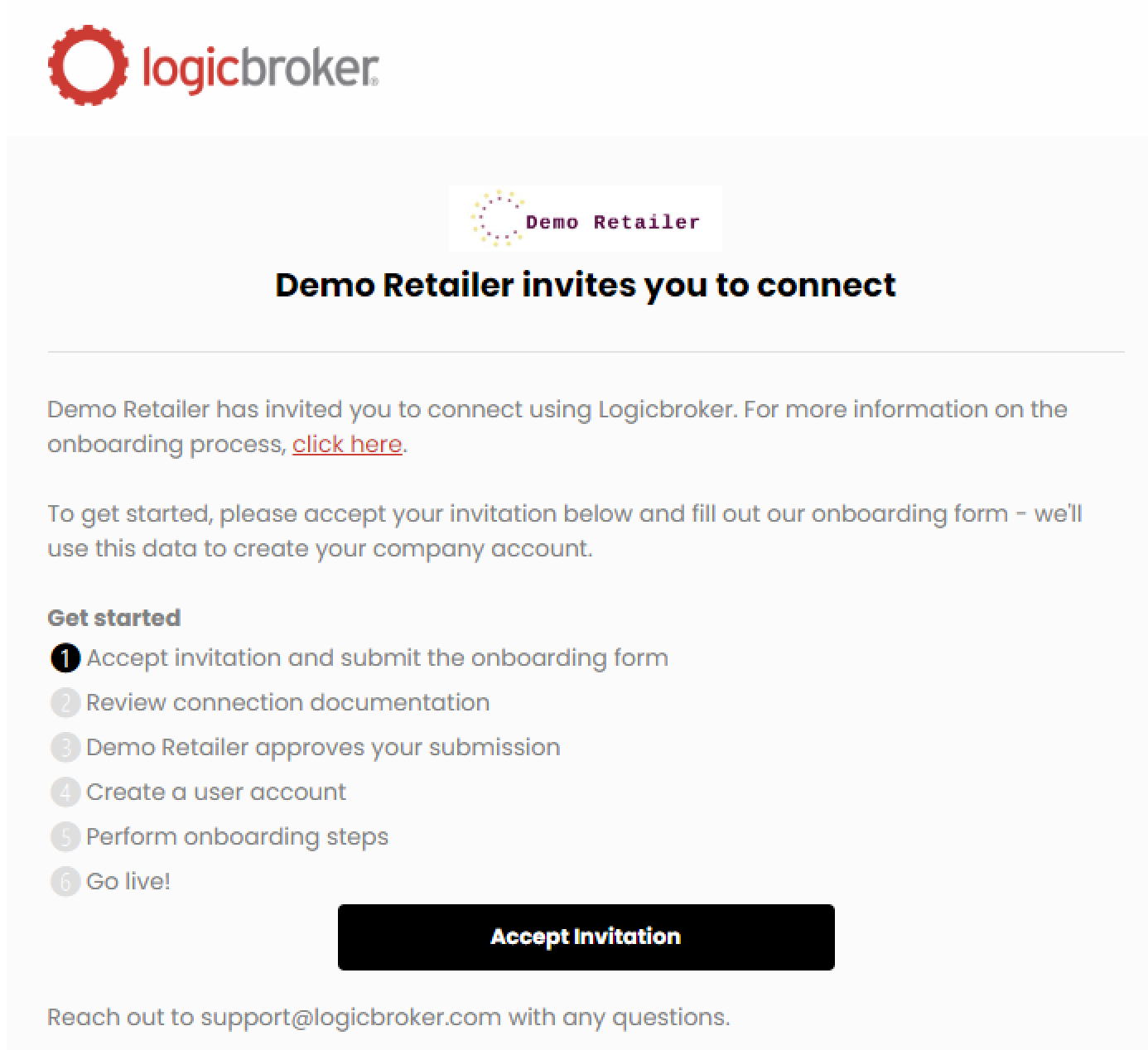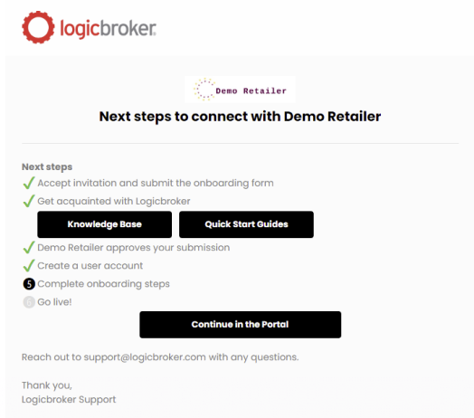 - From the "[Supplier] has been invited to connect with Joy" email, click on Accept invitation Note: If you don't see the email, check your junk folder and add do-not reply@logicbroker.com to your contact list